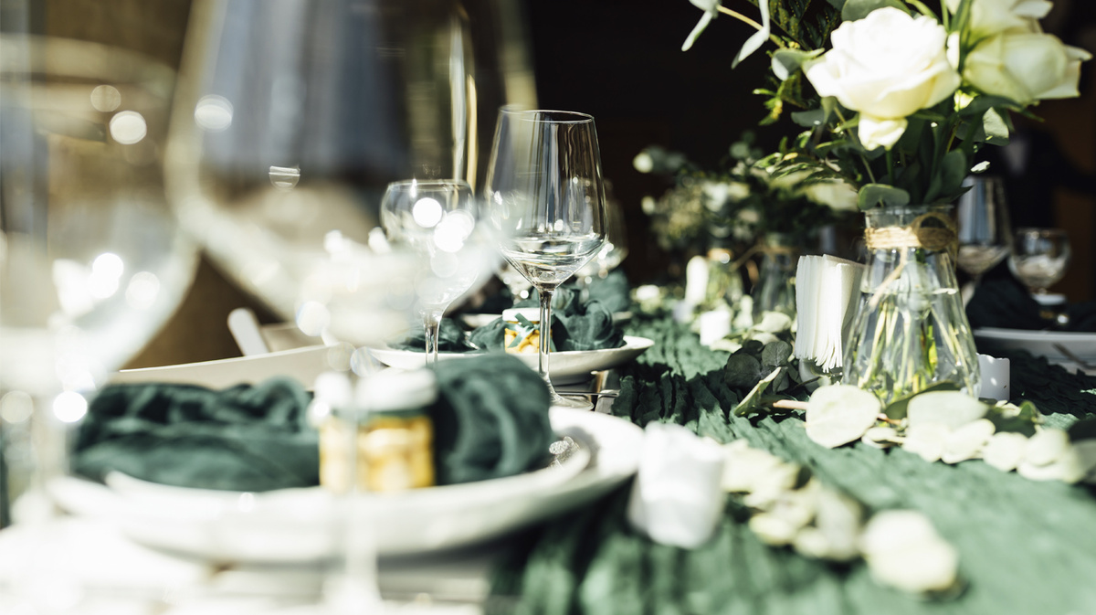 Важно, чтобы декор в центре стола был не слишком высоким (не выше 25–30 см), иначе он будет мешать гостям видеть друг друга и общаться через стол. Альтернатива — несколько маленьких одинаковых композиций вдоль всего стола.