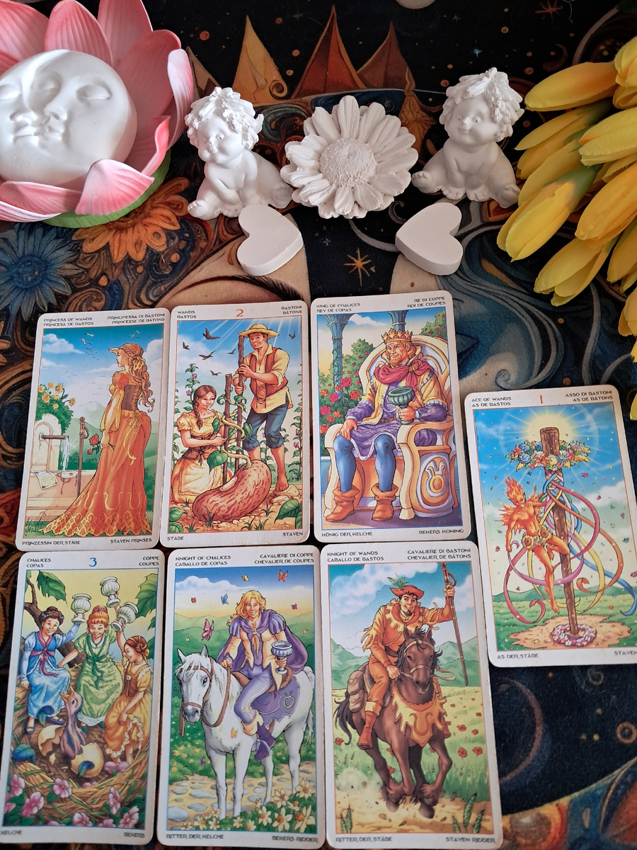Вы вытянули семь карт, и все они несут энергию молодости, роста и радости. Принцесса Жезлов – это первый огонёк энтузиазма, 2 Жезлов – взгляд вперёд и выбор пути, Король Кубков – зрелое владение своими чувствами, 3 Кубков – праздник души, Рыцарь Кубков – романтическое предложение, Рыцарь Жезлов – стремительное движение. И всё это венчает Туз Жезлов – чистый творческий импульс.