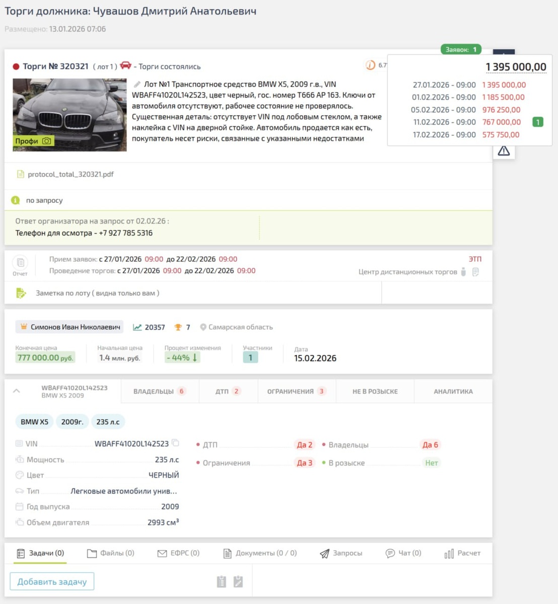 ушёл с торгов со скидкой 44% 🔻 🚗 Лот: BMW X5, 2009 г.в. 📍 Регион: Самарская область 💰 Начальная цена: 1 395 000 руб. ✅ Итоговая цена продажи: 777 000 руб. 📉 Снижение: 618 000 руб. 📊 Скидка от начальной цены: 44% 👤 Участников: 1 Автомобиль забрали за 56% от старта. На таких примерах хорошо видно, что даже ликвидный авто может уйти с очень ощутимым дисконтом, если по лоту слабая конкуренция. 〽️ НИЖЕ РЫНКА — лоты с торгов по банкротству, которые можно купить выгодно Telegram: t.me/NRlot MAX: max/NRlot Сайт: nrlot.torgi.me