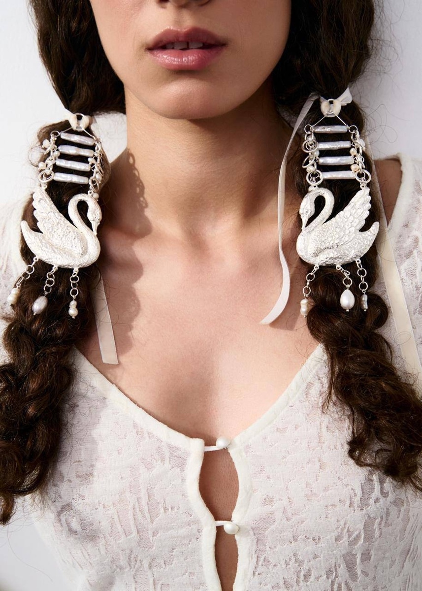 Помните у Пушкина: «Глядь — поверх текучих вод лебедь белая плывёт»? Так вот, лебеди теперь не только в сказках, но и на концах кос у смелых девушек. И мы с Машей, кажется, поплыли следом. Что случилось? Режиссёр и художница Юлдус Бахтиозина сделала коллаборацию с Poison Drop Lab. И родилась коллекция украшений-метафор, от которой у нас случился культурный экстаз. Главный удар в самое сердечко — накосники с лебедями. Для тех, кто как мы до вчерашнего дня не знал: Накосники — это не выдумка современных стилистов, а древнее традиционное украшение. Их крепили на конец косы. Наши прабабушки были те ещё эстеты: для них коса была не просто причёской, а полноценным арт-объектом. А теперь этот образ возвращается — и выглядит так, что хочется срочно отрастить волосы до пояса. Но главное — смысл Тут вообще космос. Белый лебедь — это не просто птичка, а символ альбедо. Для тех, кто не дружил с алхимией в школе: альбедо — это стадия очищения, перехода в новое состояние, прозрение. Когда после тёмн