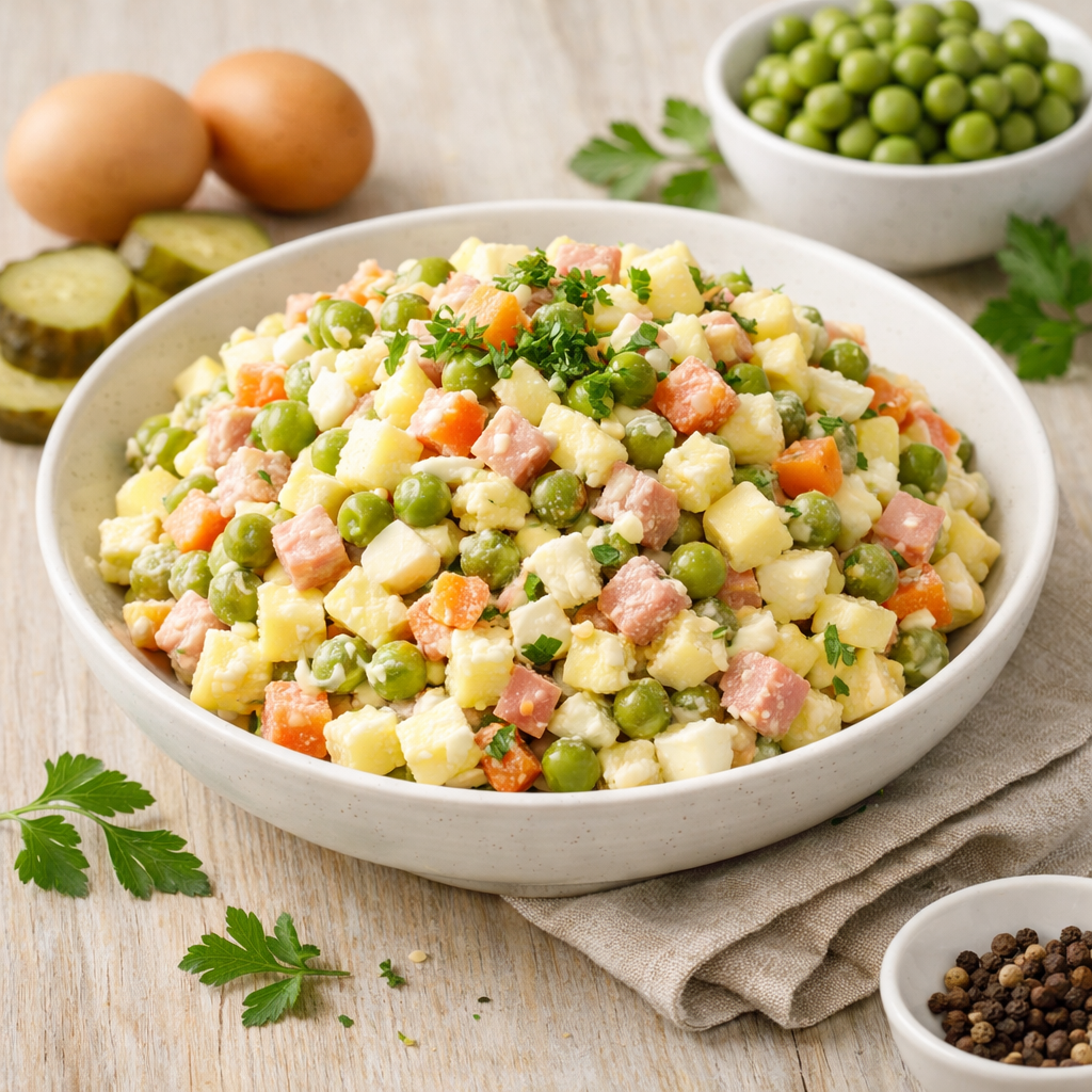 Классический салат для стола. Ингредиенты: Готовка: Калорийность примерно 200–230 ккал на 100 г. Салат с белком и углеводами. #оливье #салат #рецепты #гастро #праздник #закуска