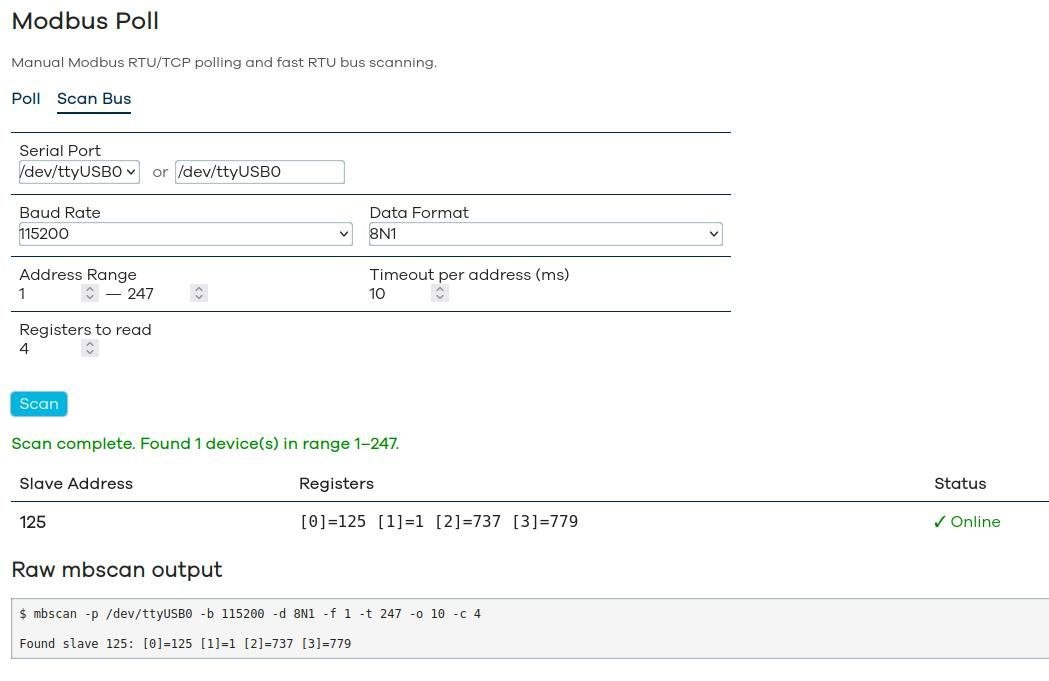 Рассказываем, зачем мы написали свой сканер Modbus-шины, и как он работает. Кто работал с Modbus RTU по RS-485, знает эту боль: подключаешься к шине, а там «чёрный ящик». Неизвестно, какие адреса у устройств, живы ли они вообще и на какой скорости работают. Ручной перебор 247 адресов стандартными утилитами - занятие для терпеливых. Знакомьтесь, mbscan — консольная утилита, которая решает эту проблему мгновенно. 🚀 В чём фишка? - Скорость: сканирует все 247 адресов за 2.5 секунды (при таймауте 10 мс). Никакого томительного ожидания. - Простота: один .c файл, никаких зависимостей. Скомпилировал и запустил где угодно: на Linux x86_64, Raspberry Pi, OpenWrt, встроенных системах. -Наглядность: не просто показывает, есть ли устройство, но и читает содержимое его регистров (по умолчанию 4 регистра на адрес). 🛠 Как это работает глазами инженера Утилита открывает последовательный порт, настраивает его через termios, и для каждого адреса в диапазоне (1-247) формирует запрос Modbus RTU с ф
