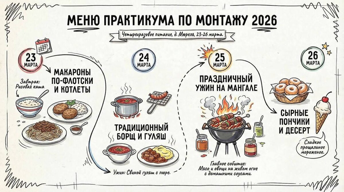Мест на этот поток уже нет. Зато есть меню, и оно стоит того, чтобы на него посмотреть 🤌 Учёба учёбой, но три дня в классной компании с таким столом - это уже