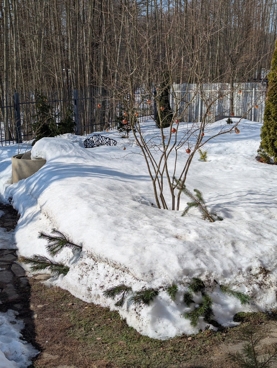 В целом становится ясно, что условно 10-летний сад в зимы с таким большим снежным покровом уходит под этот покров всем своим нижним и средним ярусом. У меня под снег ушли даже кусты высотой 1,5м. Тут, конечно, возможны варианты, наверное какие-то кусты и устояли бы, может быть регулярно стригущиеся смогли бы удержать форму, но в моем саду таких не оказалось.