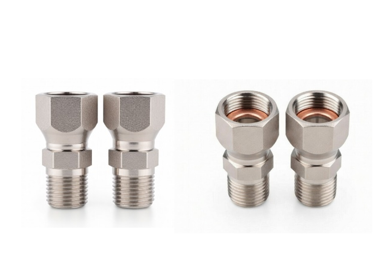 Компания НТА-Пром производит фитинги TFNCS с накидной гайкой для подключения манометров (адаптеры под манометр с поворотной гайкой) и других приборов измерения давления. Конструкция адаптера с вращающейся гайкой обеспечивает удобство позиционирования прибора при монтаже. Фитинг TFNCS выполнен из 2-ух неразъемных частей: штуцера и накидной гайки, обжатой на корпусе таким образом, чтобы обеспечить свободное вращение относительно штуцера. Присоединение к прибору (накидная гайка) Цилиндрическая метрическая резьба (M10x1, M14x1,5, M20x1,5 и др.) или цилиндрическая трубная резьба BSPP (G 1/8, G ¼, G 1/2 и др.) под любые манометры и датчики давления. Присоединение к процессу (штуцер) Наружная или внутренняя резьба: метрическая, NPT, BSPP (G-резьба) или BSPT (R-резьба) Наружная манометрическая резьба с формой торца по ГОСТ 2405-88 (для метрической резьбы) или по EN 837-1 для BSPP (G) резьбы, в коде заказа такая резьба дополняется буквой G после обозначения размера: 20M15G. Присоединение G без