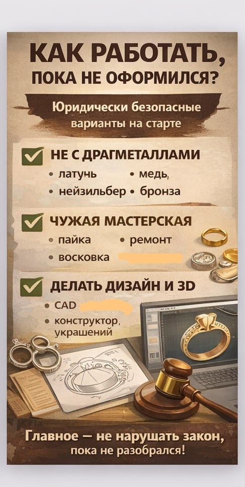 Самый разумный путь — переходный этап. Именно его проходят 80% адекватных ювелиров. Вот что можно делать легально, пока ты “на старте”: ✅ 1. Работать НЕ с драгметаллами латунь медь нейзильбер бронза Ты оттачиваешь: пайку, сборку, посадку камней, форму, стиль — без уголовных рисков. ✅ 2. Работать в чужой мастерской Ты не владеешь металлом — ты оказываешь услугу: пайка ремонт сборка восковка Юридически ты — мастер, а не участник оборота драгметаллов. ✅ 3. Делать дизайн и 3D Ювелир — это не только верстак. Ты можешь зарабатывать как: CAD-дизайнер конструктор украшений автор моделей под литьё 📌 Тут ты вообще не касаешься металла юридически. ❌ Что нельзя делать “по-тихому” продавать золотые изделия без ИП принимать лом “на переплавку” покупать металл с рук паять золото “для знакомых за деньги” Это уже не серость, а прямое нарушение. Ювелирка — это не “запретная профессия”. Это медленный вход с пониманием правил.