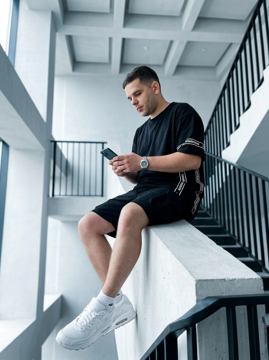 🤖Генерировать можно здесь: 👉БОТ ДЛЯ ГЕНЕРАЦИИ Режим Nano Banana 2/Pro ИНСТРУКЦИЯ **Портрет молодого мужчины с короткой стрижкой, черты лица строго перенесены с загруженного фото без изменений, сидящего на перилах лестницы в современном минималистичном интерьере. Он одет в черную футболку оверсайз с белыми надписями по бокам, черные шорты, белые носки и массивные белые кроссовки Nike. В руках держит смартфон, взгляд опущен вниз — выражение лица спокойное, задумчивое, немного отстранённое. На запястье видны серебристые наручные часы. Фон — светлые стены, геометрические линии потолка и перил, чёрные металлические балясины лестницы. Освещение естественное, рассеянное, создающее мягкие тени и подчёркивающее объём пространства. Ракурс камеры — средний план, снятый снизу вверх, что придаёт композиции динамику и акцентирует фигуру. Глубина резкости средняя: передний план (фигура) чёткий, фон слегка размыт для выделения объекта. Качество изображения высокое, детализированное, с холодной цвето