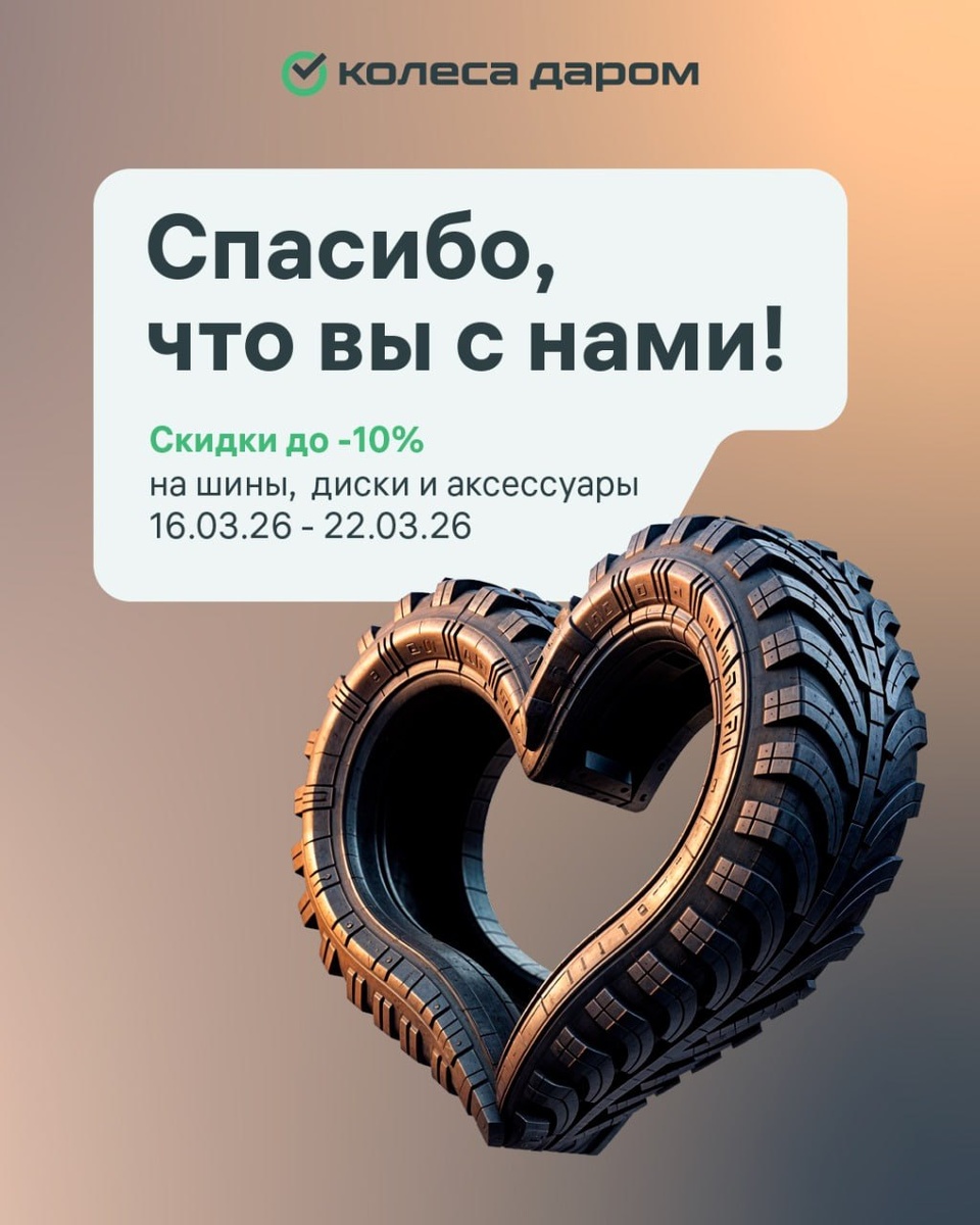 »🤝 19 марта – Международный день клиента! Повод поблагодарить каждого из вас, подкрепив это СКИДКАМИ!💞 –10% на мотошины и квадрошины, тормозные колодки, автолампы и аксессуары; –7% на шины Autogreen, Evergreen, Lanvigator, Linglong, Triangle, Atlander, а также на автомасла, фильтры и АКБ; –5% на автодиски Евразиа-ТАПО и KDW. ✅ ПРОМОКОДЫ ЗДЕСЬ 👈 Акция действует с 16 по 22 марта 2026 г.