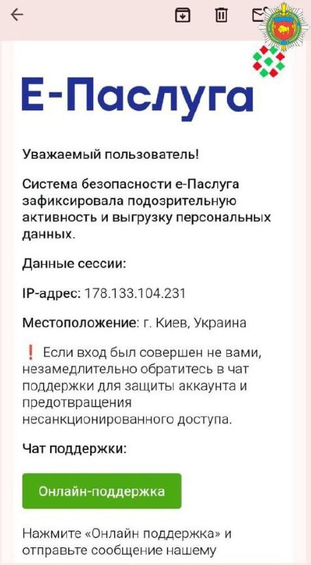 » 🔴 Гражданам поступают сообщения и звонки якобы от имени «Е-Паслуга». Злоумышленники сообщают о «зарегистрированном обращении», просят не закрывать чат и далее пытаются: 🔴 получить данные для входа в личный кабинет 🔴 выманить коды из SMS 🔴 перевести общение в сторонние мессенджеры 🔴 получить доступ к вашему аккаунту ✅ Обращаем внимание: 🔴 Сотрудники Е-Паслуга никогда не запрашивают пароли и коды подтверждения. 🔴 Официальная поддержка не просит переходить по сомнительным ссылкам и писать в личные аккаунты Telegram. 🔴 Все обращения обрабатываются только через официальный сервис. 💻 Если вам написали или позвонили: 🟢 Не сообщайте коды и персональные данные. 🟢 Не переходите по подозрительным ссылкам. 🟢 Прекратите разговор и заблокируйте контакт. 🟢 Сообщите о попытке мошенничества в официальную поддержку.