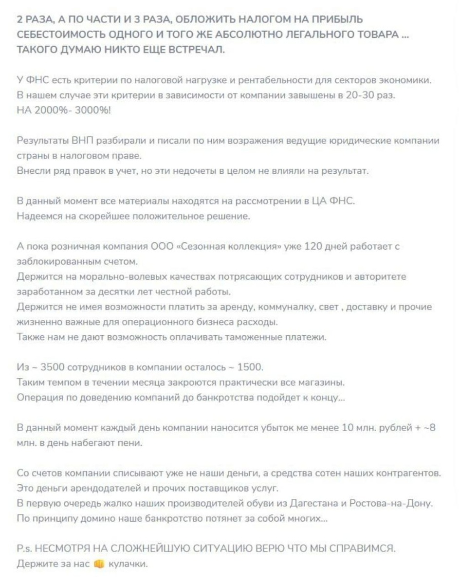 Гендиректор сети Zenden Андрей Павлов сообщил о закрытии магазинов из-за налоговых претензий на 12 миллиардов рублей и блокировки счетов.