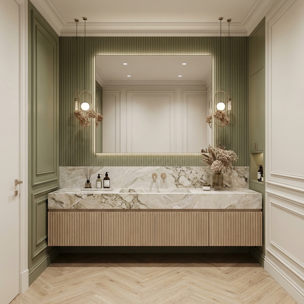 Это цвета, которые визуально выглядят дорого сами по себе. Они не нуждаются в ярких компаньонах, но умеют их принимать. Для ванной в стиле неоклассика такая палитра становится идеальной базой — спокойной, но глубокой.