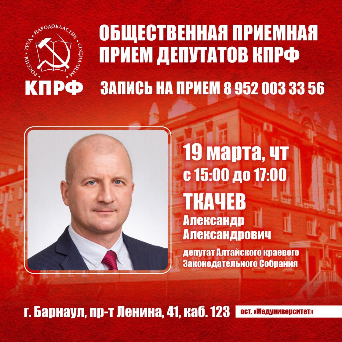 Приемные дни депутатов Алтайского краевого Законодательного Собрания по адресу: