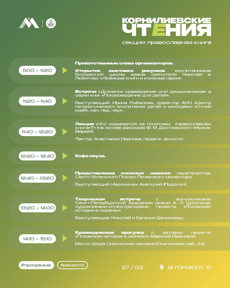 В рамках Корнилиевских чтений в Псковском Молодежном центре состоится секция «Православная книга» 27 марта 2026 года, рамках XXIII Корнилиевских православных образовательных чтений, в Молодежном центре города Пскова пройдет работа секции «Православная книга».