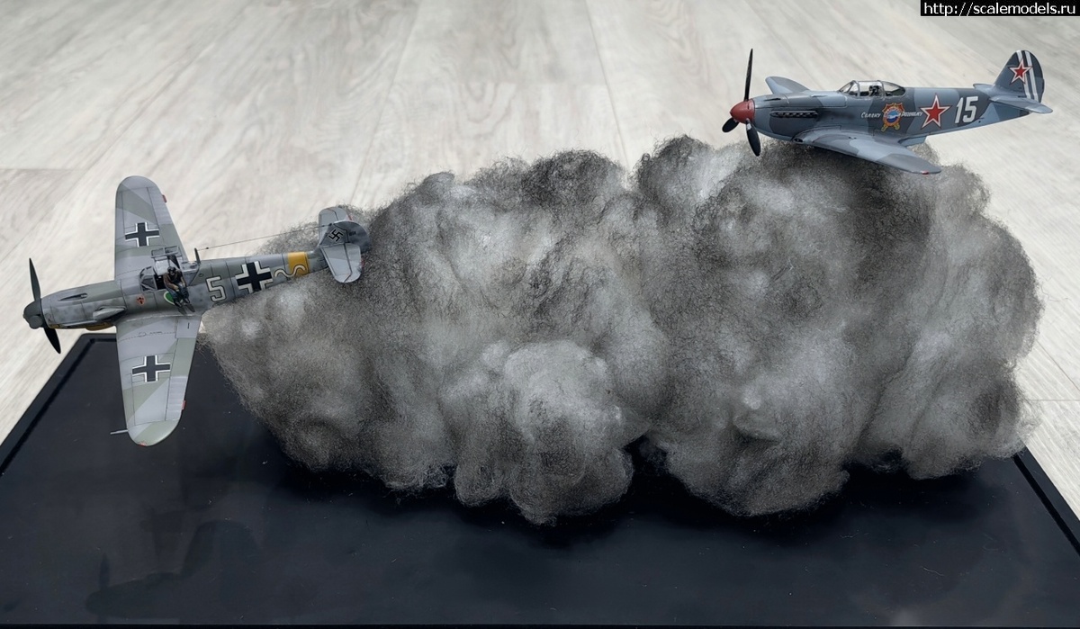 . Советским летчикам героям Великой Отечественной Войны посвящается.Вдохновившись буржуйской диорамой, фото которой мне попалось в сети, решил собрать что-то подобное. Основной целью была ТЕМА. Соответствие сюжета историческим событиям не преследовалось. Для постановки было решено подобрать что-либо из уже собранного, но обдумав все проволочки на этом пути, как ликвидацию шасси, установку закрытых щитков, открытую кабину и усаживание пилотов, принял решение сделать заново. В закромах отыскал ЯК-3 от Звезды, используемый последние несколько лет в качестве кошки, а среди снятых с литников деталей трех мессеров: Академи, Ревелл и Звезда/Италери остановился на звездовском, решающим фактором стала форма кока. Прочитать полную статью