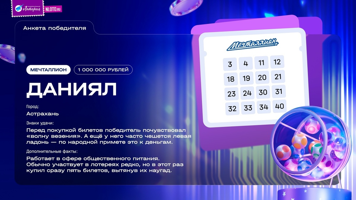 Даниял из Астрахани стал победителем лотереи «Мечталлион» и выиграл 1 миллион рублей. Счастливчик уверяет, что участвует в лотереях редко. Но в этот раз решение купить билеты возникло спонтанно — после встречи с друзьями он зашел в магазин и взял сразу пять штук, вытянув их наугад. Перед этим у Данияла было странное ощущение — будто накрыла «волна везения». А он шутит, у него часто чешется левая ладонь — говорят, это к деньгам. По словам Данияла, удача похожа на алгоритм случайных чисел: каждое «нет» однажды приводит к долгожданному «да». Выигрыш он планирует потратить на семейный отдых или вклад в ипотеку. Фото: Национальная лотерея