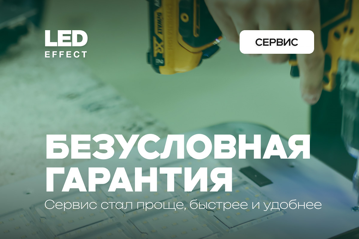 Сервис стал проще, быстрее и удобнее для вас. ✅ Бесплатный ремонт ВЕСЬ срок: независимо от причины поломки (кроме механических повреждений). ✅ Обращение за минуту: рекламационный акт или форма на сайте. ℹ️ Памятка и инструкция для клиентов — на странице ↗ сервисного отдела Доверьтесь ЛЕД-Эффект — мы уверены в нашем качестве!