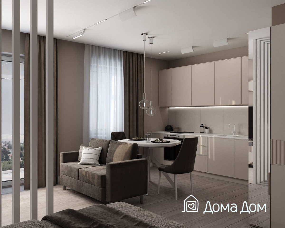 Главная задача в студии — сделать так, чтобы не возникало ощущения, что вы спите прямо на кухне. Когда кухня, кровать, диван и стол находятся в одном пространстве, комната легко начинает выглядеть как место, где всё происходит одновременно: готовят, работают, отдыхают и спят. Без зонирования интерьер быстро превращается в одну большую комнату без логики. При этом разделить пространство часто можно обычной расстановкой мебели. Иногда достаточно изменить расположение нескольких предметов, чтобы кухня, гостиная и спальная зона начали восприниматься как разные части квартиры. Вот четыре способа зонировать студию с помощью мебели. 1. Зонирование стеллажом Один из самых практичных способов разделить пространство — поставить открытый стеллаж поперёк комнаты. Кровать или спальную зону размещают в глубине помещения, а стеллаж становится условной границей между спальней и гостиной. Со стороны гостиной это обычная мебель для хранения: на полках можно разместить книги, декор или растения. Почему э