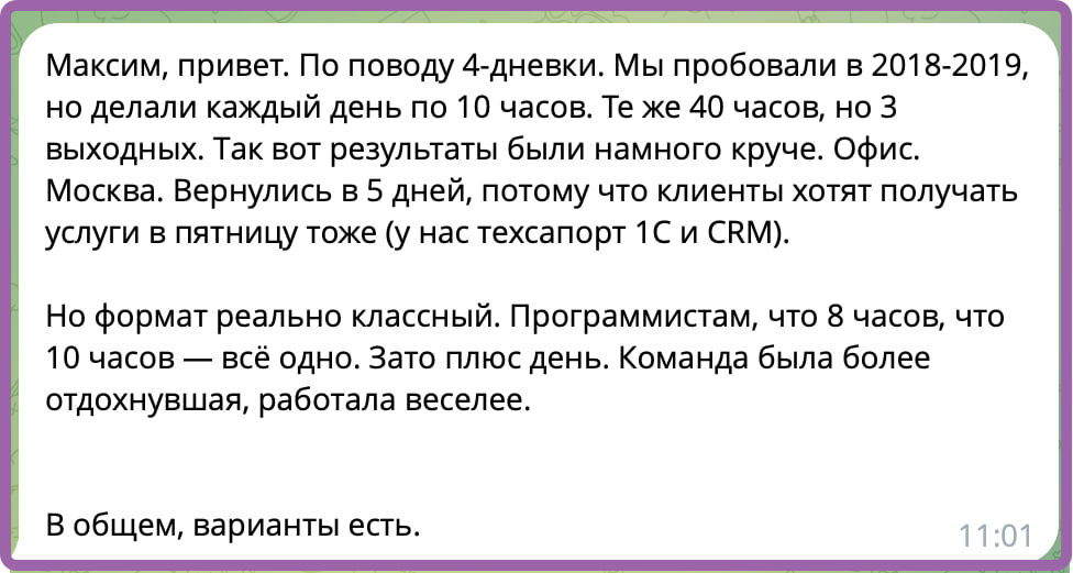 Опытом делятся со мной по поводу 4-х дневки. Но это офисная работа. Почитайте на картинке, прикольно... Но если у вас гибрид или, упаси-боже, удаленка полная - смысла в 4-х дневки не вижу. @clickfraud.ru