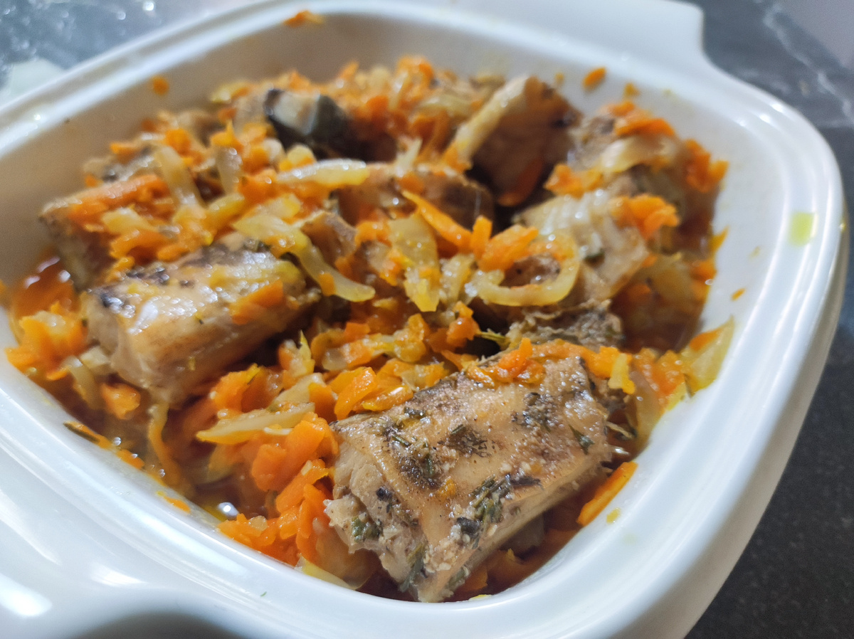 Даже после тушения и маринования рыба конгрио почти не поменяла цвет , розоватость ее осталась. Но может это потому что здесь присутствовал соевый соус и морковь , все это тоже дает такой теплый оттенок.