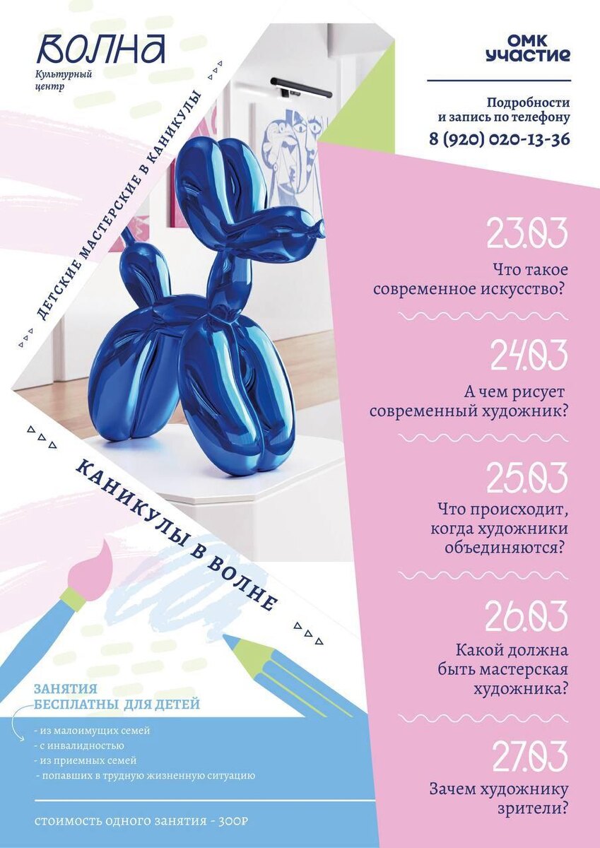 » Культурный центр «Волна» приглашает школьные классы и группы ребят 7-12 лет провести время интересно и с пользой. 23 марта — 4 апреля Каждый день с 11:00 до 13:00 мы будем узнавать новое, обсуждать и много творить. Наши мастерские для детей включают в себя не только необычный мастер-класс, но также и беседу с нашим педагогом-художником Екатериной Стрельцовой. Выбирайте интересную вам тему, а время и дату мы сможем подобрать для вас по телефону +7 (920) 020-13-36 (Екатерина, запись для групп). #АфишаВыксаРФ 👈 актуальные городские мероприятия Что такое современное искусство? Разберемся, что может называться искусством, а что — нет, и создадим свою работу в необычной технике. А чем рисует современный художник? Узнаем про художников, которые творили не совсем обычными способами, и проведем свои живописные эксперименты. Что происходит, когда художники объединяются? Обсудим, зачем художникам коллективное творчество, вспоминаем интересные примеры из истории, а затем в командах нарис