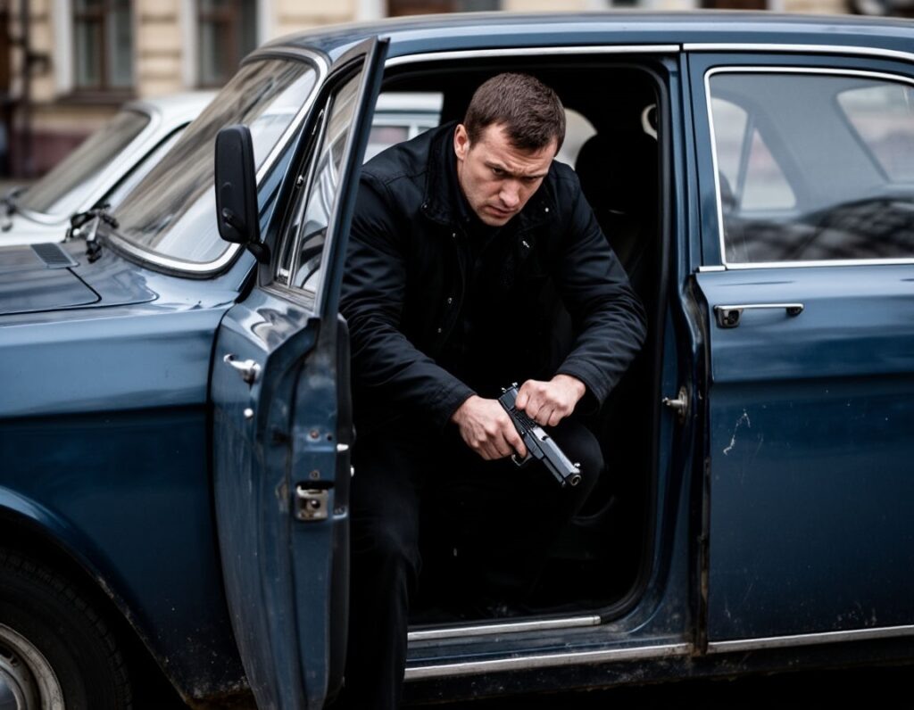 Он вышел из машины, достал из тайника запасной пистолет и направился к старой «Волге», припаркованной неподалёку.
