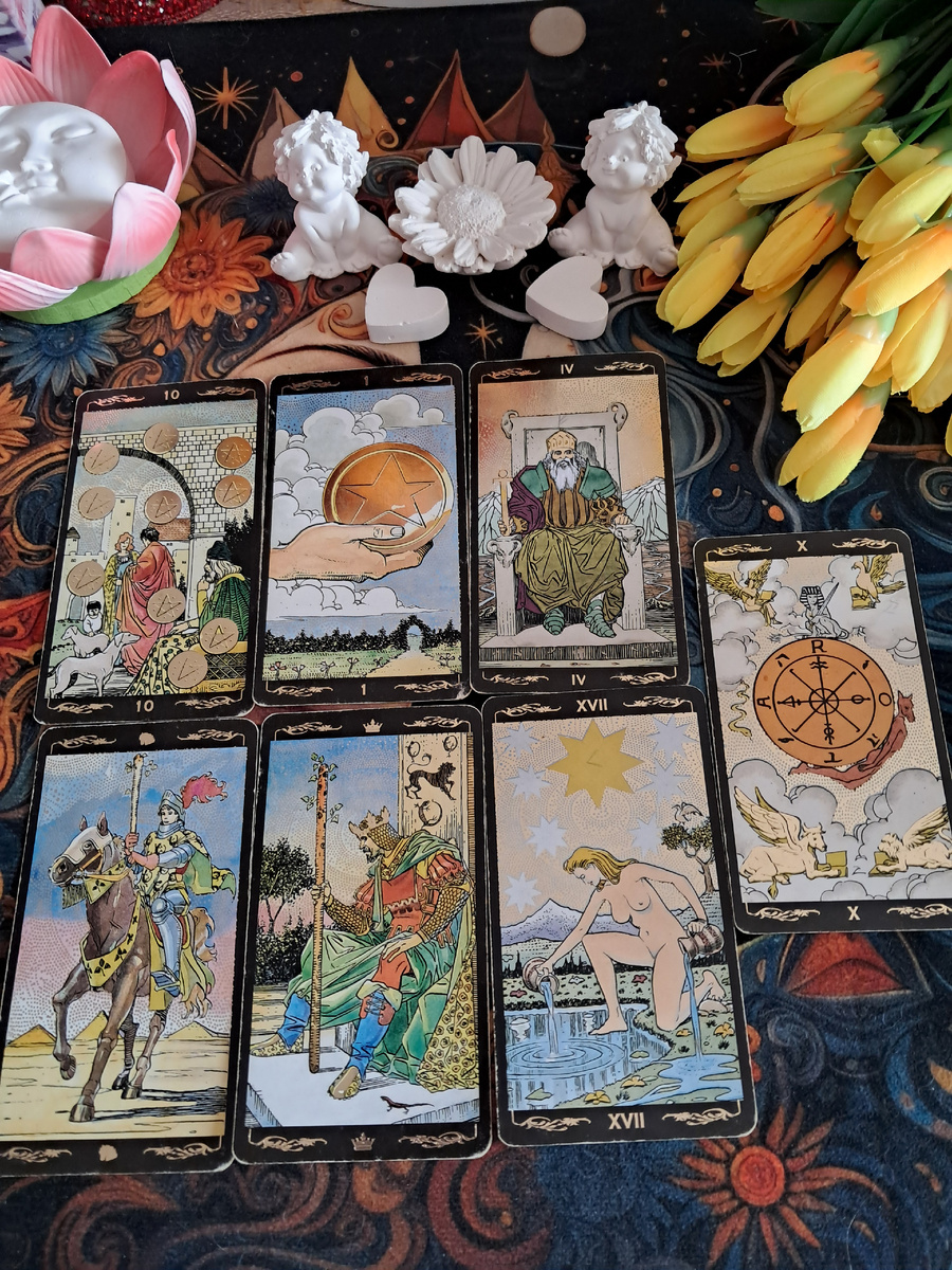 Высшие силы готовят для вас полную чашу: материальное изобилие (10 и Туз Пентаклей), официальный союз и поддержку (Иерофант), яркие эмоции и нужных людей (Рыцарь и Король Жезлов), исполнение мечты (Звезда) и судьбоносные перемены (Колесо Фортуны).