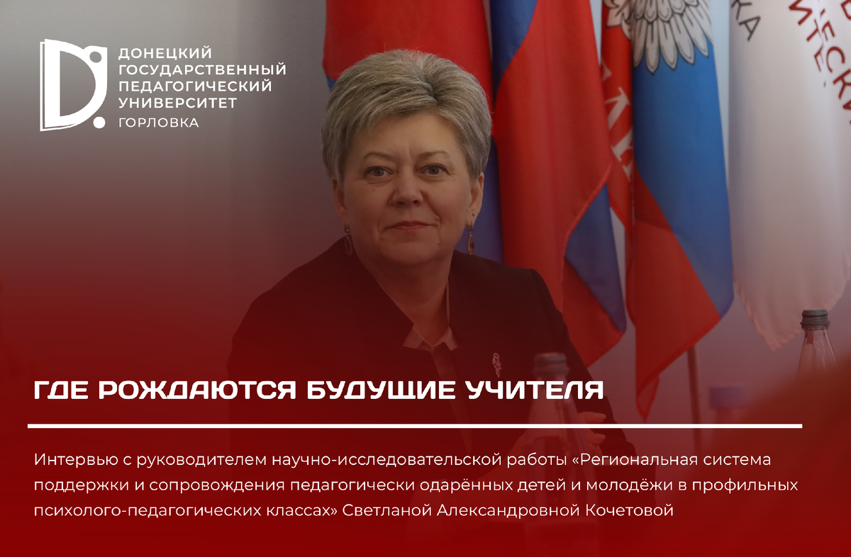 Интервью с руководителем научно-исследовательской работы по теме «Региональная система поддержки и сопровождения педагогически одарённых детей и молодёжи в профильных психолого-педагогических классах» Светланой Александровной Кочетовой. Сегодня российская система образования всё активнее обращается к вопросу ранней профориентации будущих педагогов. По инициативе Министерства просвещения Российской Федерации реализуется целый комплекс научных исследований, направленных на развитие педагогического образования и формирование кадрового потенциала школы. Одно из таких исследований выполнено в Донецком государственном педагогическом университете им. В. Шаталова и посвящено созданию региональной системы поддержки и сопровождения педагогически одарённых школьников. Проект стал частью государственной научной повестки, направленной на развитие психолого-педагогических классов и формирование устойчивого интереса школьников к профессии учителя. О том, как создаётся сообщество будущих педагогов и п