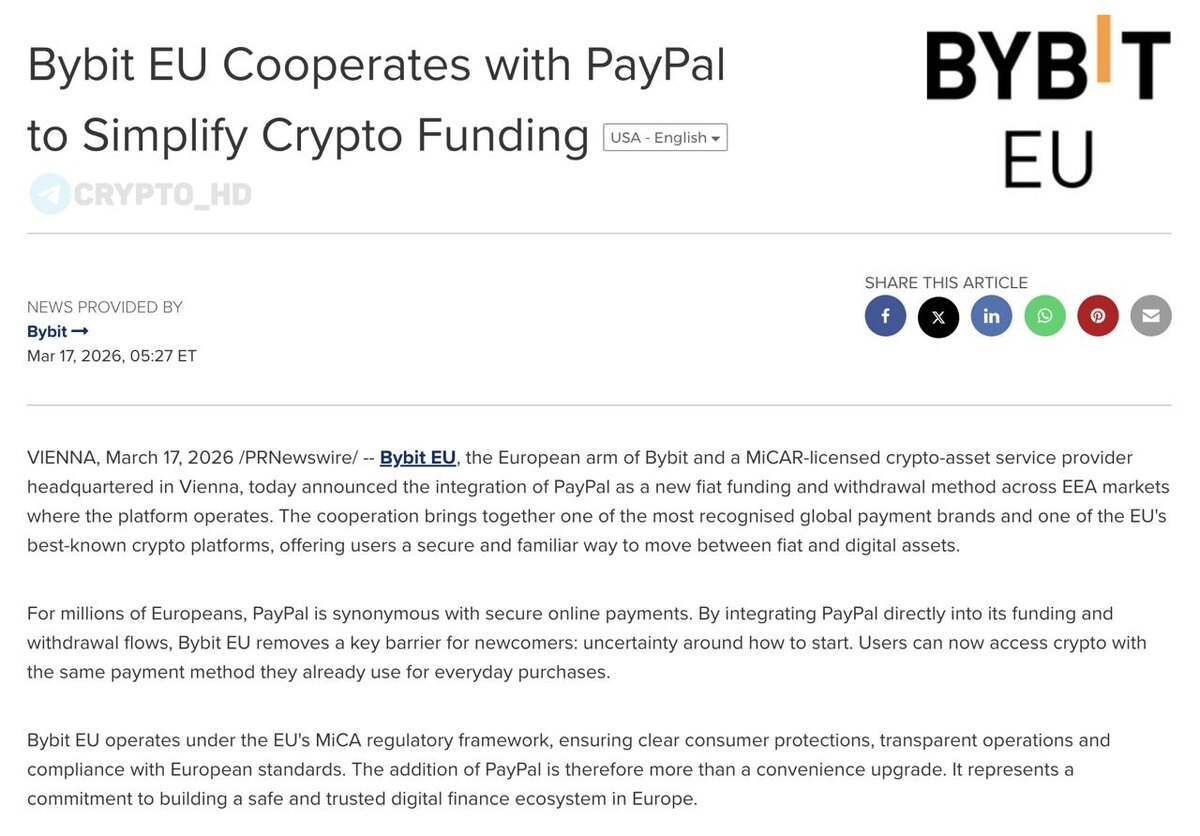 🤝 Bybit и PayPal объявили о партнерстве (релиз) ➥ Европейское подразделение биржи Bybit добавит PayPal как способ пополнения и вывода фиатных средств в странах ЕЭЗ. ➥ Пользователи смогут покупать криптовалюту и выводить деньги без банковских переводов и открытия новых аккаунтов. ➥ Интеграция проходит в рамках регулирования MiCA в ЕС. Ранее: Bybit и Coinbase Crypto Headlines