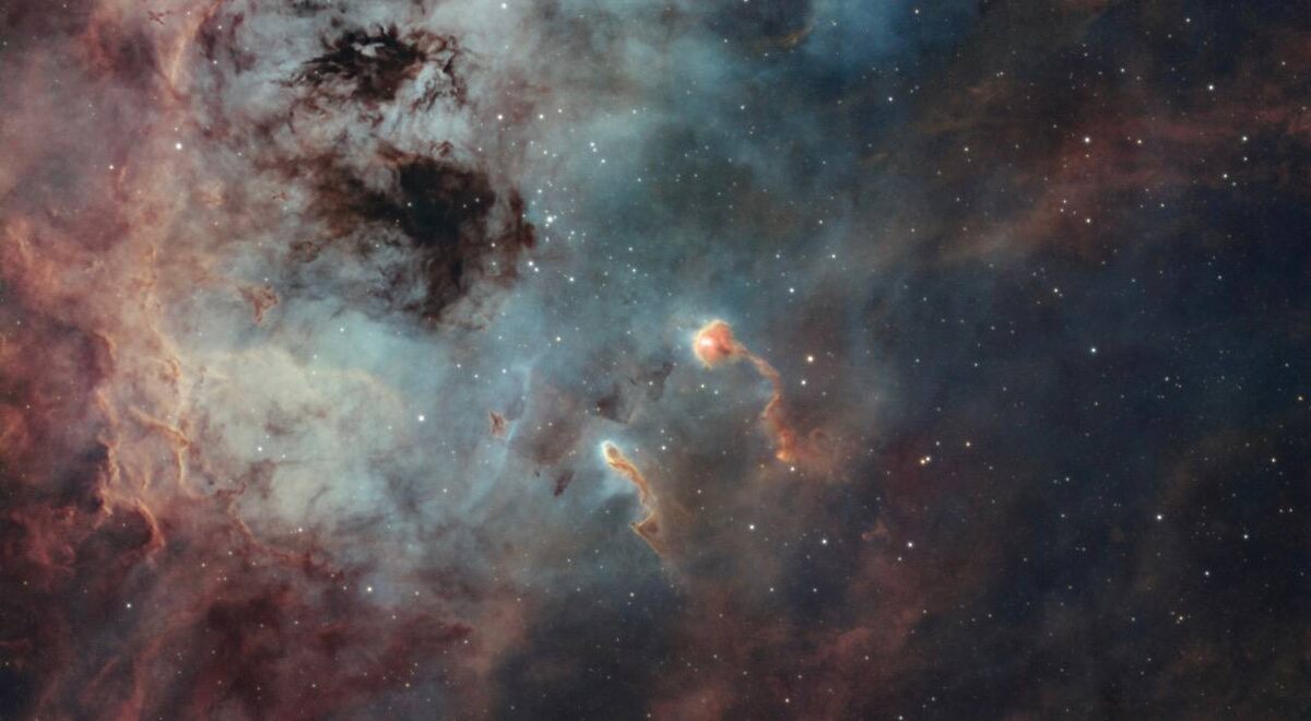 Дата: 2026-03-17 Автор снимка: Nico Carver В этом космическом «пруду» из газа и пыли плавают удивительные создания - два гигантских головастика, застывшие в вечном танце. Перед вами центральная область эмиссионной туманности IC 410, снятая с использованием палитры «Хаббл» (комбинация широкополосных и узкополосных фильтров с добавлением ближнего инфракрасного диапазона). Кто такие «головастики»? Ниже и правее центра видны два плотных сгустка холодного газа и пыли, получившие название Головастики IC 410. Их длина - около 10 световых лет! Это области активного звездообразования: внутри них, вероятно, прямо сейчас рождаются новые звёзды. Как они появились? Форму головастикам придаёт мощное излучение и звёздные ветра от молодых горячих звёзд скопления NGC 1893, которое и подсвечивает всю туманность. Головы сгустков ярко очерчены ионизированным газом, а хвосты вытянуты в сторону от центрального скопления. Звёздные ясли: Скопление NGC 1893 сформировалось всего 4 миллиона лет назад (по ко