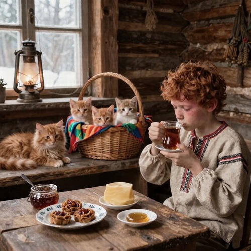 В старой избушке, да в русской печи Бабушка Маня пекла калачи. Пахло в жилище мёдом, вареньем. Громко трещали в печке поленья. С тенью играл огонь керосинки, Кто- то шуршал в плетёной корзинке. На мягком платке возились котята: Тимошка, Платошка, кошечка – Нята, А рядом с корзинкой – рыжая мать, Люськой, привыкли все, кошку ту звать. Взгляд рыжей кошки с котят не сходил, Пристальным, пилящим взгляд Люськин был. Хлопнула дверь, мальчишка вбежал, Внук бабы Мани, звали – Иван. Валенки скинул, шапку под лавку! Люська привстала, когти на лапках… Мимо прошёл – на столе калачи С пылу, да с жару из русской печи. Ел в обе щёки голодный мальчишка. Лоб украшала огромная шишка. Ваньке подраться, как нам сказать «здрасте», Всё с рук сходило, везунчик, отчасти… Съеден был быстро вкусный калач. Рядом звучал то ли писк, то ли плач. Ваня взглянул на старую лавку, Люська привстала, когти на лапках. Пара шагов – у корзинки Иван, Выстроил быстро он, глупый свой план. Рыжий, как мама, пушистый Тимошка Перв