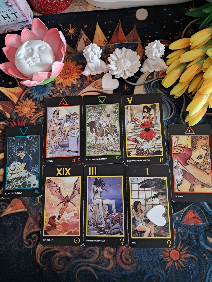 Этот расклад на колоде Манара (эротическое таро) показывает, что ваши отношения находятся на перепутье, но скорее это пауза, необходимая для перезагрузки, чем окончательная точка. Большинство карт указывает на мощный позитивный потенциал и глубокую связь, которая просто временно столкнулась с препятствиями или усталостью.