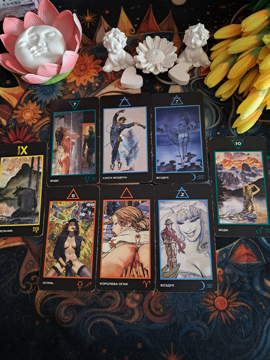 · 7 Вода (7 Кубков): Он испытывает целый спектр эмоций, но они туманны и противоречивы. С одной стороны, вы вызываете у него сильное притяжение и фантазии, с другой — он сам не может понять, чего именно хочет. Возможно, он идеализирует вас или видит в вас разные образы, что мешает ясности.