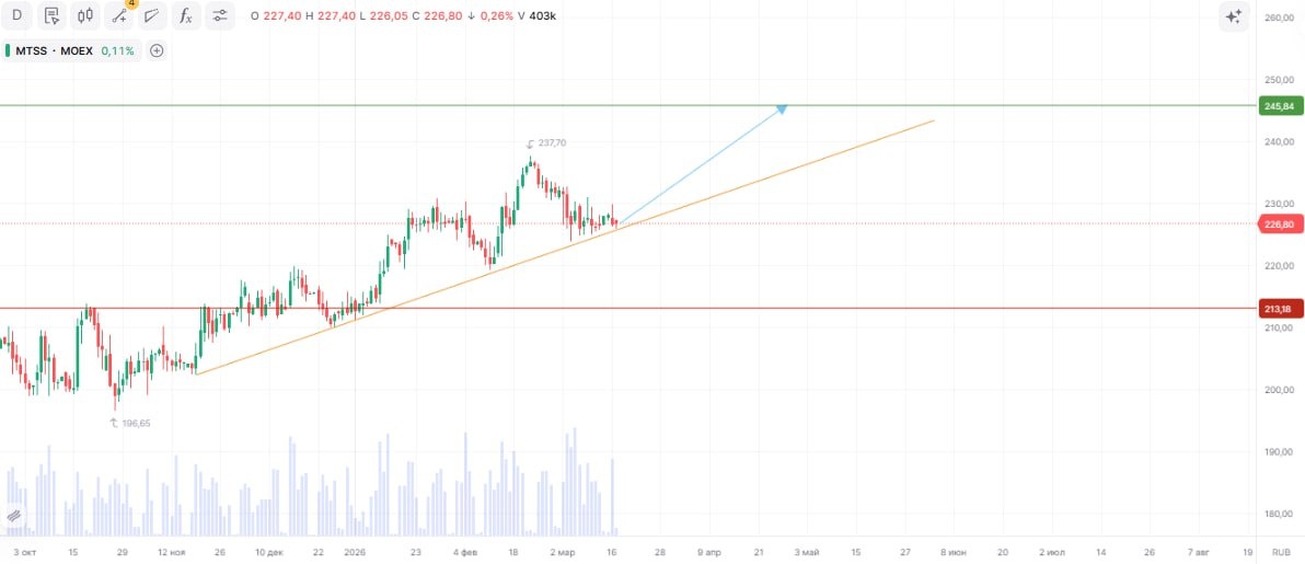 » Тикер: #MTSS Идея: Long ⬅️ Срок идеи: 3-4 недели Цель: 245,84 руб. Потенциал идеи: 8,37% Объем входа: 8% Стоп-приказ: 213,18 руб. 🧳 Технический анализ Актив находится в устойчивом восходящем тренде. При объеме позиции в 8% и выставлении стоп-заявки на уровне 213,18 руб., риск на портфель составит 0,48%. Соотношение прибыль/риск составляет 1,39. 📱 Фундаментальный фактор #МТС — ведущий российский телекоммуникационный оператор и технологический холдинг с развитой экосистемой цифровых сервисов. Компания показала сильные квартальные результаты: выручка выросла на 18,5% до 213,8 млрд руб., OIBDA увеличилась на 16,7%, а чистая прибыль, относящаяся к акционерам, выросла почти в шесть раз до 6 млрд руб., что подтверждает эффективность стратегии диверсификации и устойчивость базового телеком-бизнеса. Долговая нагрузка остается под контролем: чистый долг сократился до 426,3 млрд руб., а соотношение чистый долг/OIBDA улучшилось до комфортных 1,6. Снижение капитальных затрат на 5,3% при сохра