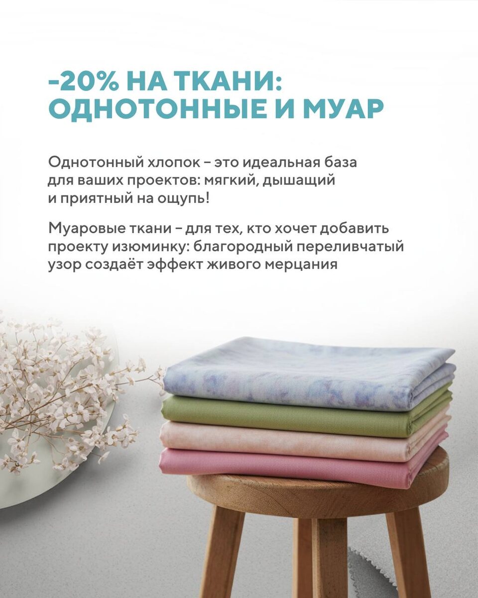 😍 До 29 марта в наших магазинах и на сайте действует скидка -20% на ткани: однотонные и муар 🪡 Однотонный хлопок - это идеальная база для ваших проектов в стиле пэчворк: мягкий, дышащий и приятный на ощупь! Создавайте гармоничные композиции, комбинируя разные оттенки и фактуры. Муаровые ткани - для тех, кто хочет добавить изюминку в свои лоскутные изделия: благородный переливчатый узор создаёт эффект живого мерцания, придавая вашим творениям особую элегантность. Ткань муар голубая – 336884 Ткань однотонная желтая – 332943 Ткань муар розовая – 308937 Ткань муар коричневая – 297808 Ткань муар синяя – 308938 Ткань однотонная зеленая – 308909 Посмотреть все ткани