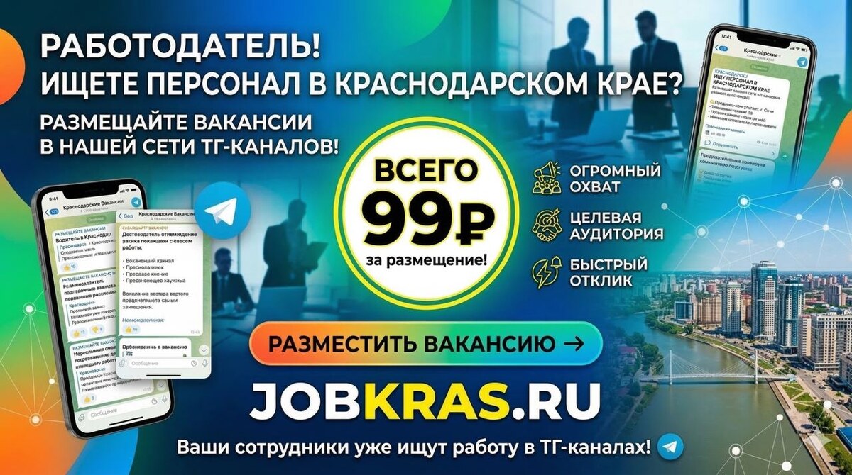 Telegram — это самый прямой путь к кандидатам прямо в их смартфонах. Мы предлагаем размещение ваших вакансий в наших профильных каналах на максимально выгодных условиях. 💼 Тариф: размещение 1 объявления в 1 канале стоит всего от 99 рублей! Вы сами выбираете, где именно опубликовать пост. ссылка для размещения https://jobkras.ru/