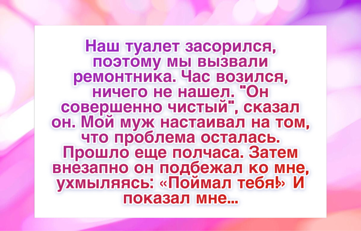 “У нас засорился унитаз. Мастер долго ничего не находил, говорил, что все чисто. Муж настаивал, что проблема есть.