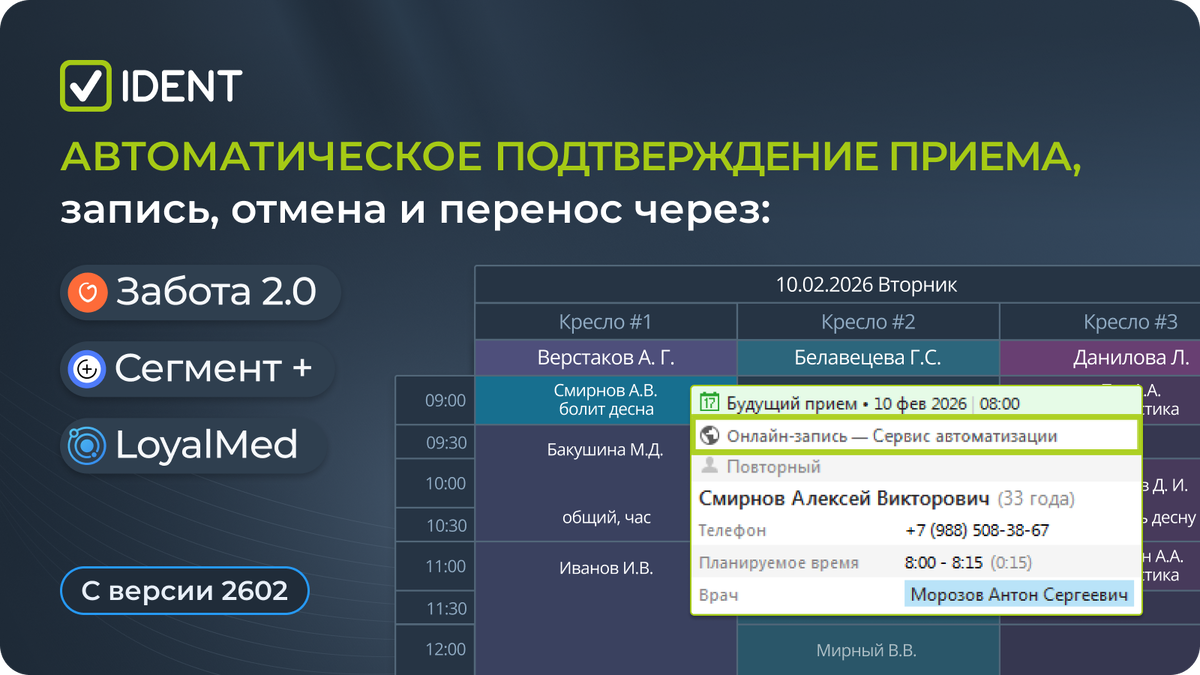 То, чего все так долго ждали! В IDENT доступно подтверждение приема, запись, отмена и перенос через сервисы автоматизации сценариев! И да — сразу с тремя партнёрами. Мы провели опрос среди клиентов и подключили самые востребованные сервисы, чтобы у вас был выбор. Как это упрощает работу? Разберем на примере подтверждения приемов. 🔽 Раньше администраторы вручную обзванивали пациентов, фиксировали подтверждения, переносы и отмены. Это отнимало много времени и повышало риск ошибок. 🔼 Теперь процесс автоматизирован, а все изменения сразу отображаются в IDENT: ✔️Пациенты, которые подтвердили прием исчезают из виджета «Обзвон на ближайший день». ✔️В расписании напротив записи появляется галочка «Подтвержден». ✔️В расписании, карточке пациента и отчётах видно, что подтверждение прошло через сервис. ✔️Запросы на перенос, отмену и другие сообщения попадают в виджет «Срочные обращения», чтобы ничего не потерялось. В результате нагрузка на администраторов уменьшается, ошибок становится в разы м