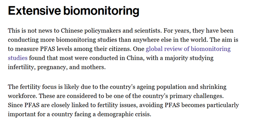 На сайте европейской экологической неправительственной организации ChemSec (https://chemsec.org/is-china-about-to-declare-war-on-pfas/ ) появилась статья с таким названием. Далее свободный пересказ этой статьи. Европейские экологи серьезно относятся к действиям китайский властей в области экологии, проводя параллель с результатами китайской войны против загрязнения воздуха. С 2013 года в течение 10 лет в результате выполнения программы правительства, уровень загрязнения воздуха в Китае уменьшился на 41%, а ожидаемая продолжительность жизни увеличилась на два года. В статье перечисляются следующие четыре признака подготовки китайского правительства к войне против «вечных химикатов»: Заражённая «вечными химикатами» окружающая среда Примерно половина глобального рынка PFAS находится в Китае. Поверхностные воды и земля вокруг предприятий, использующих «вечные химикаты» в технологической цепочке загрязнены. Исследователи обнаружили, что почва сельхозугодий также загрязнена этими токсинами