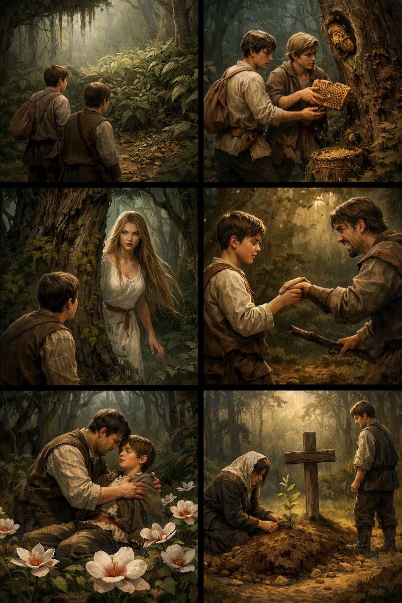 Дупло нашлось быстро. Оно зияло чёрным провалом в стволе старого дуба, на высоте человеческого роста. Пчёлы гудели сонно и важно, облепив край летка плотным живым кольцом. Петро, накинув холстину на лицо и заткнув рукава, полез с дымокуром. Мёд был густой, янтарный, с горчинкой, стекал по рукам тяжёлыми каплями. Павло снизу принимал соты, укладывал в берестяные кузова, и лицо его сияло от восторга.