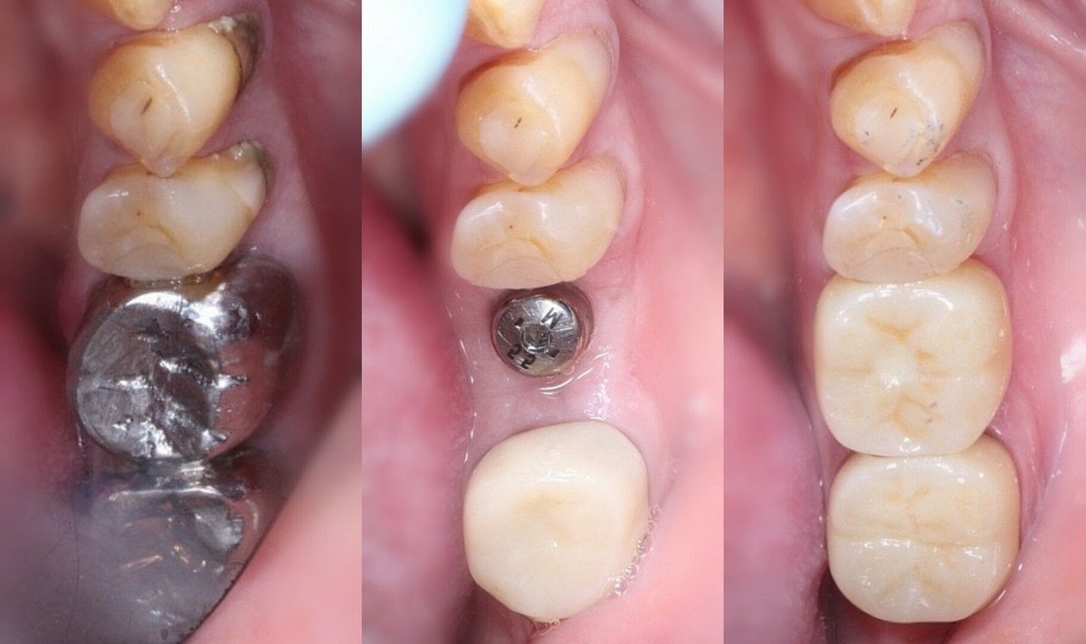 6 и 7 были покрыты металлическими коронками. Под коронкой было выявлено сильное разрушение шестого зуба. Докторами было предложено пациенту следующее решение: - удаление 6ки с последующей имплантацией; - препарирование 7ки и установка коронок из диоксида циркония на 2 жевательных зуба. После удаления 6ки и заживления пациенту хирургом -имплантологом был установлен имплантат. В нашей клинике используются системы Impro, Astra, А2. После периода приживления имплантата был поставлен формирователь десны. Процесс формирования десневого края занимает около 10-14 дней. Следующий этап - изготовление и установка коронок. Ортопед сделал цифровые слепки, техник в лаборатории по слепкам изготовил коронки. После успешной примерки коронки были зафиксированы. Получился вот такой эстетичный результат. Пациент остался доволен результатом. Работа выполнена хирургом-имплантологом Крячковой Н.В. и ортопедом Соколовым Н.В.