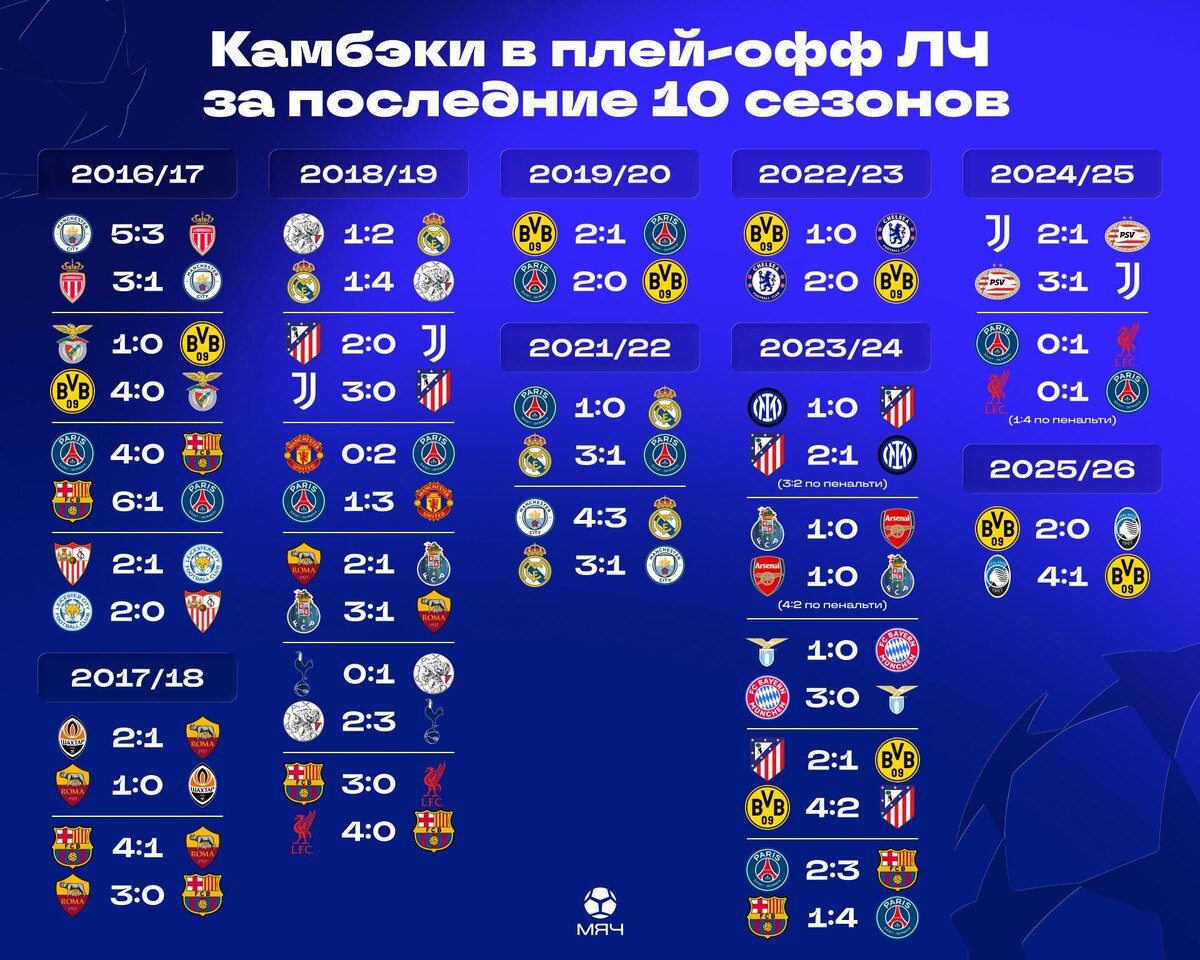 За последние 10 сезонов команды, которые проигрывали в первом матче, шли дальше 24 раза. Вот только разница в 3+ мяча отыгрывалась всего трижды («Барсой», «Ромой» и «Ливерпулем»). Сам «Сити» 2 раза попадал под камбэки («Монако» в 2017-м и «Реал» в 2022-м). Ну а мадридцы вылетали после победы в первом матче только от «Аякса» в 2019-м. @myach