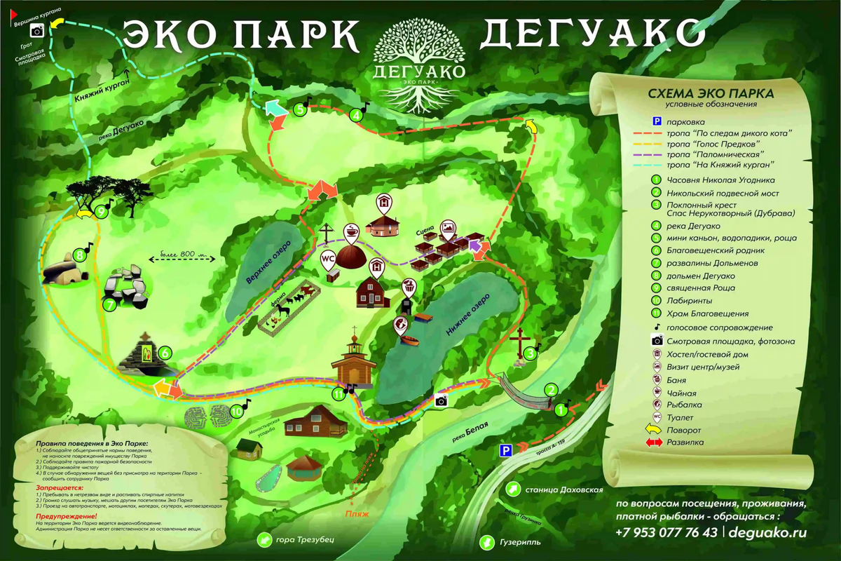 В 7 километрах от ст. Даховская расположен экопарк Дегуако. Настоящий островок, который поможет отвлечься от шумных, пыльных городов, почувствовать настоящую гармонию с природой. Широкий выбор развлечений будет интересен молодежи, пожилому поколению, семейным парам с детьми. Можно заказать экскурсию с гидом или воспользоваться самостоятельной экскурсией с аудио гидом — эта замечательная возможность познакомиться с Эко парком Дегуако в не принужденной форме, двигаясь со своим таймингом. В озере Зеркальном осуществляется платная рыбалка.
