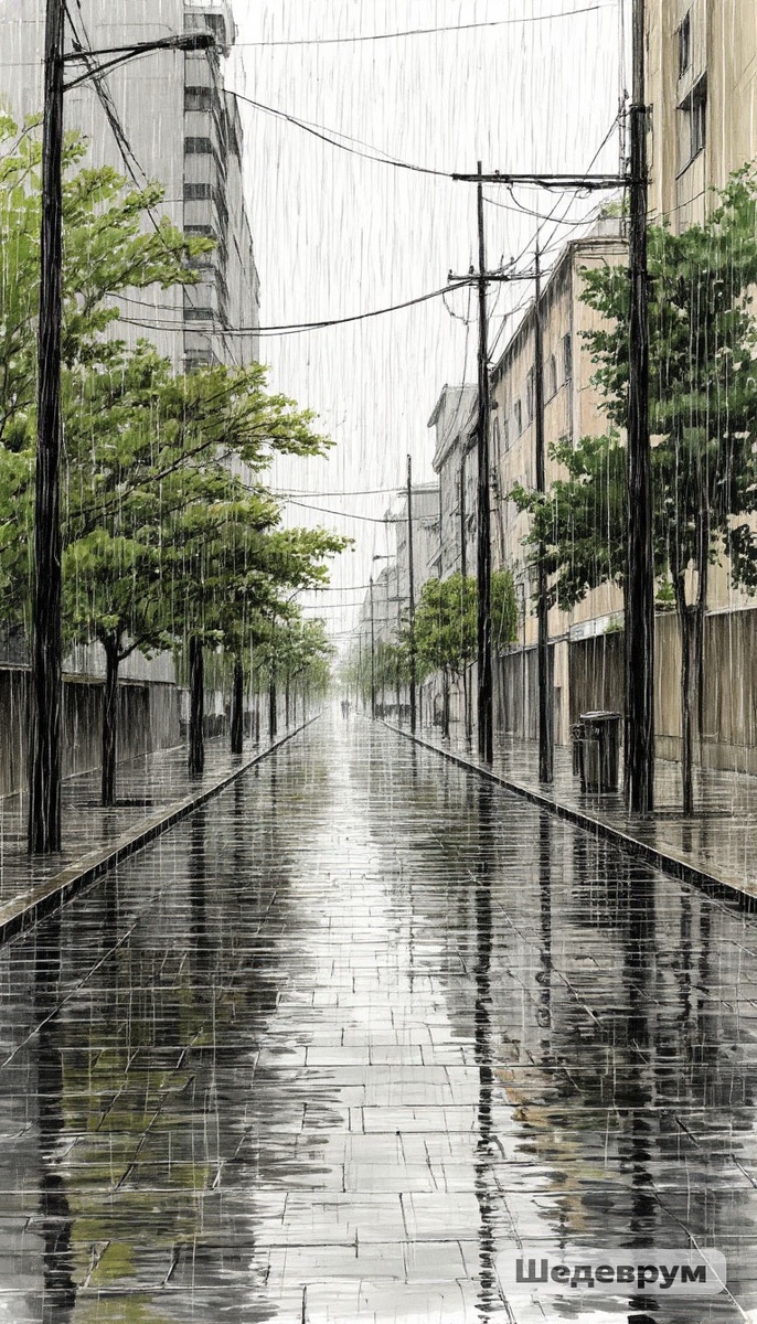 Всё начинается не с воды, а со света. Воздух становится плотным, серым, но каким-то бархатистым. Свет будто оборачивают в вату. Первые капли — это не удар, а пунктир. Они оставляют на сухом асфальте следы, похожие на монетки. Пыль на дороге мгновенно темнеет, и воздух наполняется озоном — запахом свежести, который не купишь в магазине.