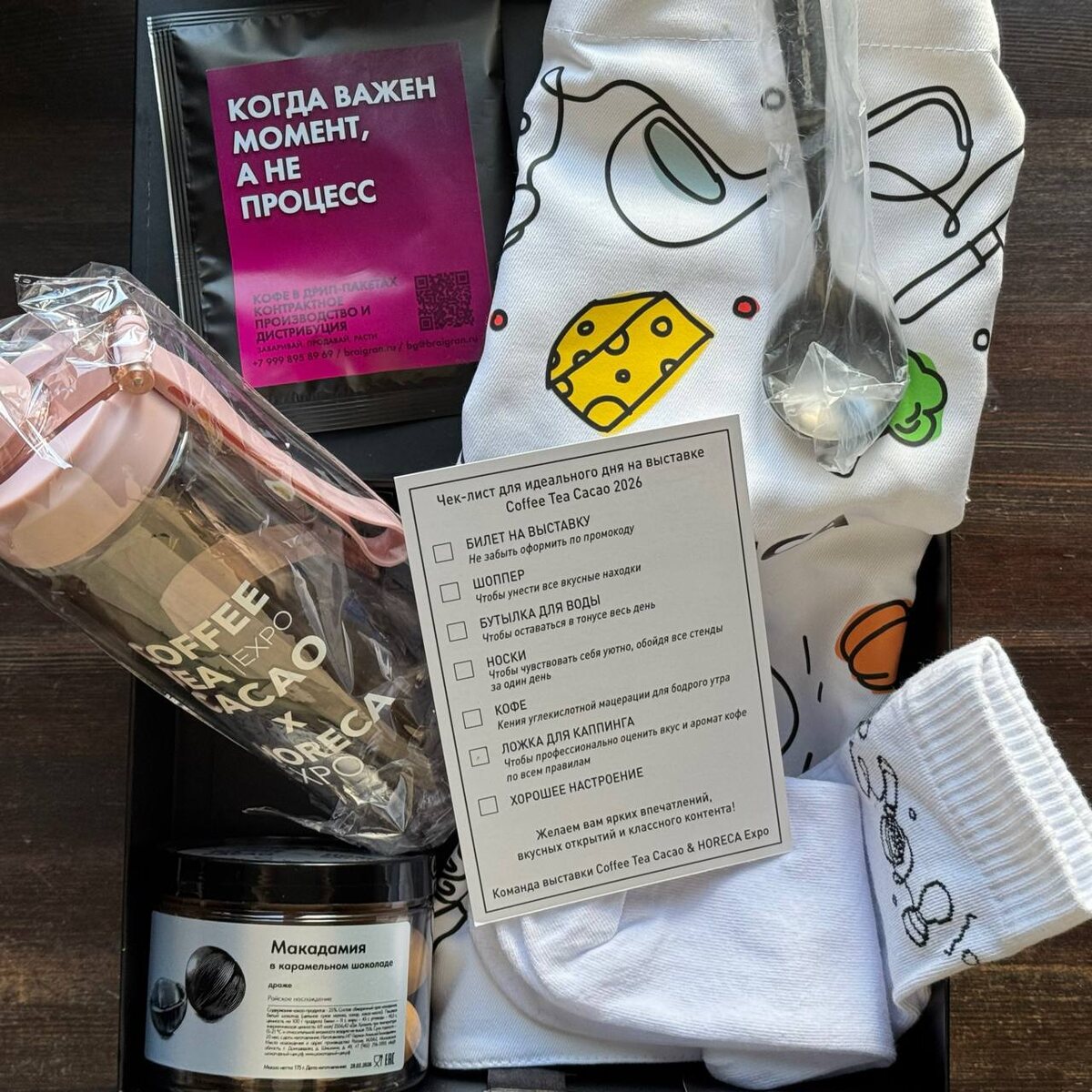 Мне приехала коробка от организаторов выставки Кофе Чай Какао Экспо. Всё содержимое сопровождается чек-листом. Давайте пройдёмся по нему и заодно посмотрим, сколько тут всяких интересностей! • Билет на выставку 🎫 У меня уже есть. Если вы ещё не купили, то можете воспользоваться промокодом отсюда. • Шоппер 👜 Полезная вещь не только для выставки, но и в быту. До сих пор регулярно пользуюсь шопперами с прошлых выставок. • Бутылка для воды 💦 Не менее полезная штука. Пригождается в поездках и спортзале. • Носки 🧦 Прикольно и неожиданно! Буду модным ходить по выставке ))) • Кофе ☕️ Это дрип (или как сейчас принято – фильтр-пакет) с Кенией углекислотной мацерации от Brai Gran. • Ложка для каппинга 🥄 Неожиданно и приятно! Теперь у меня есть именная ложка для каппинга! • Хорошее настроение 🥳 Ну это и так есть. Осталось выбрать лекции для посещения и отметить стенды, на которых позависаю подольше. @Кофезавр · Youtube · Тelegram+чат · VK · Boosty · Dzen · Reddit · Мах+чат