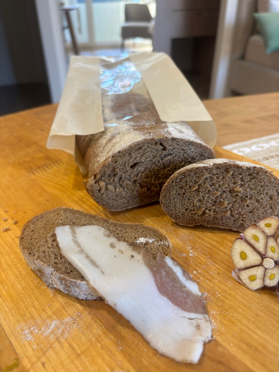 Этот ржаной или черный хлеб ( как говорят в народе) не имеет примитивной и прямой кислотности ржаного хлеба, тк красный солод прекрасно гармонирует и раскрывает с новыми нотками ржаную муку. Мякиш этого хлеба не плотный, а скорее воздушный, корочка тоненькая
