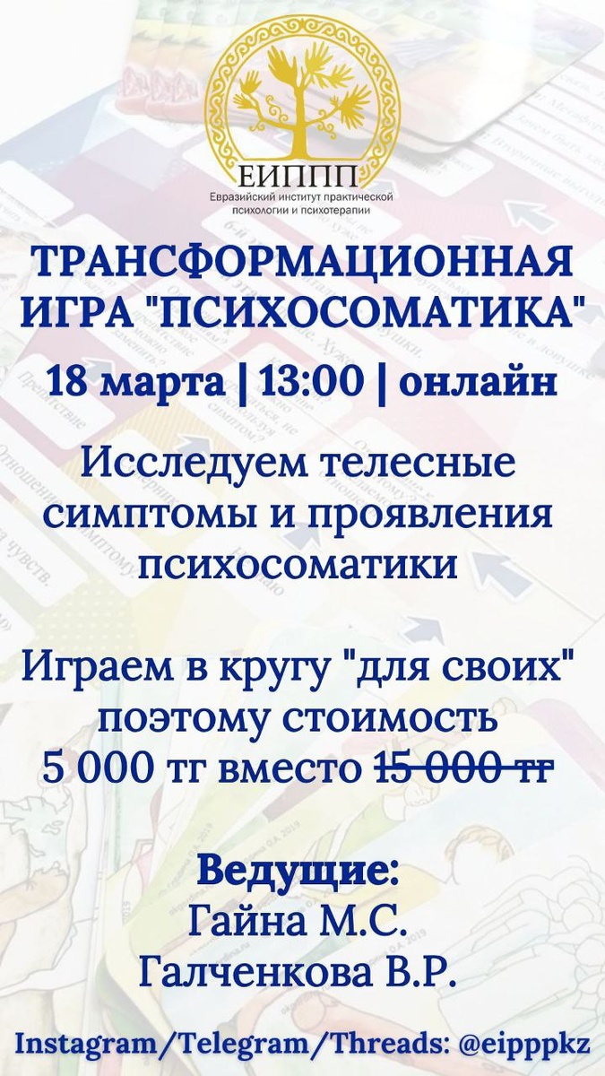Ребята, уже завтра старт 3-дневного онлайн-марафона "Как полюбить себя" и завтра же пройдёт трансформационная игра "Психосоматика" в онлайн-формате "для своих" по приятной стоимости!