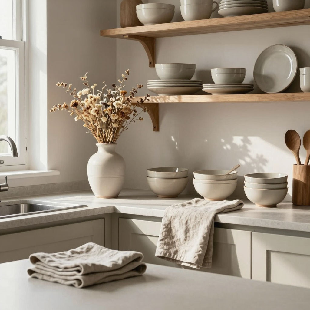 — Особенности: Много света (большое окно или легкий тюль), открытые системы хранения, но дозированно, живые растения.