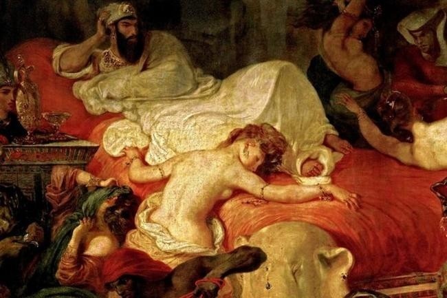 Представьте себе картину: гибнет величайшая империя древности, пылает столица, обнаженные наложницы в ужасе мечутся под ножами убийц, кони бьются в предсмертной агонии... А в центре этого хаоса, на роскошном ложе, лежит мужчина. Он безучастно смотрит на происходящее, подперев голову рукой, и, кажется, вот-вот уснет.