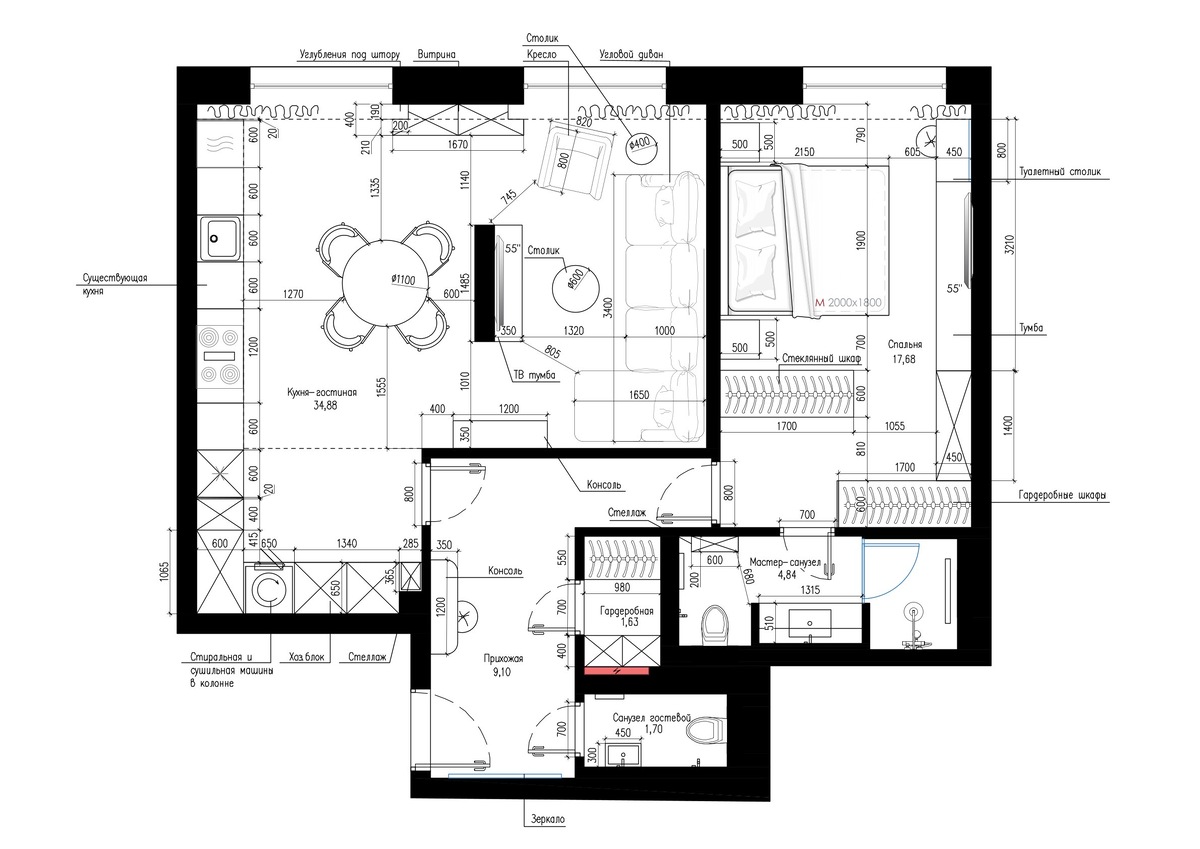 Процесс: провели базовые ремонтные работы по переносу розеток/светильников, мокрых зон, декорированию стен. Запрос на яркий, акцентный, функциональный интерьер на базе спокойной отделки. Вся встроенная и отдельно стоящая мебель выполнена на заказ. Проведена работа с организатором пространства - проектирование шкафов, внутреннее наполнение органайзерами, контейнерами и аксессуарами для хранения вещей. Результат: сдача с первого показа 700 тыс. ₽/месяц. Прихожая Кухня Кухня-гостиная Мастер-спальня Гостевой санузел Мастер-ванная