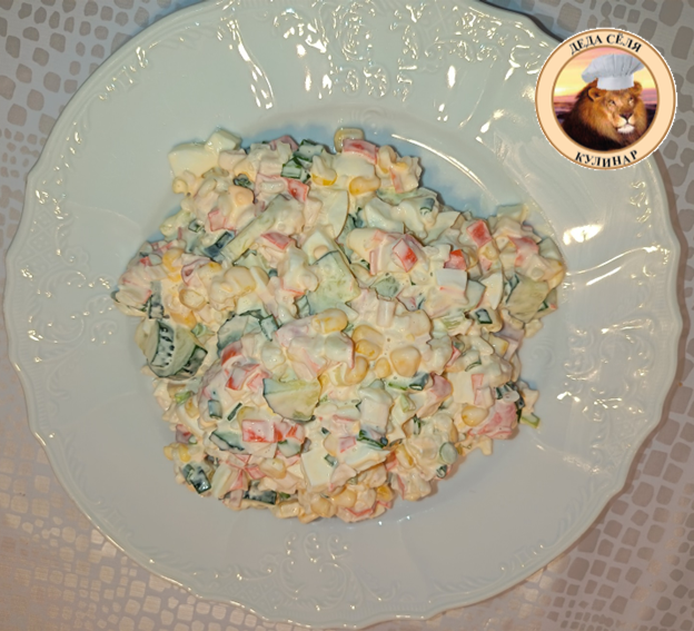 Ингредиенты: 1. Крабовые палочки 400 г; 2. Рис 1 пакетик (80 г); 3. Яйца куриные 6 шт.; 4. Огурцы свежие 300 г; 5. Лук зелёный 1 пучок (50 г); 6. Кукурузы консервированная 1 банка (425 мп); 7. Соль по вкусу; 8. Майонез по вкусу. Приготовление: 1. Кастрюлю с водой ставим на огонь, воду доводим до кипения, солим. В кастрюлю с кипящей водой опускаем пакет риса и варим его до готовности, согласно указаниям на пачке. Выкладываем в тарелку и остужаем. 2. Яйца куриные моем под проточной водой, кладем их в кастрюлю с водой, ставим кастрюлю на огонь и варим яйца вкрутую, минут 10-12 после закипания воды. Остужаем яйца в холодной воде, чистим от скорлупы и режим небольшими кубиками. 3. Огурцы вымыть, отрезать кончики и некрупно порезать. 4. Крабовые палочки слегка разморозить, очистить от упаковки и порезать некрупными кубиками. 5. Зелёный лук промыть под прохладной водой и мелко нарезать. 6. Банку с консервированным горошком открыть, жидкость слить. 7. Все ингредиенты выкладываем в салатник,